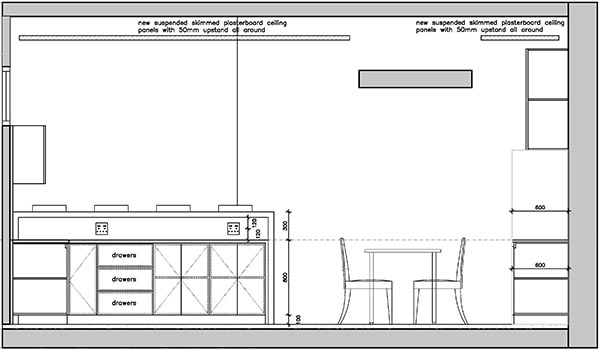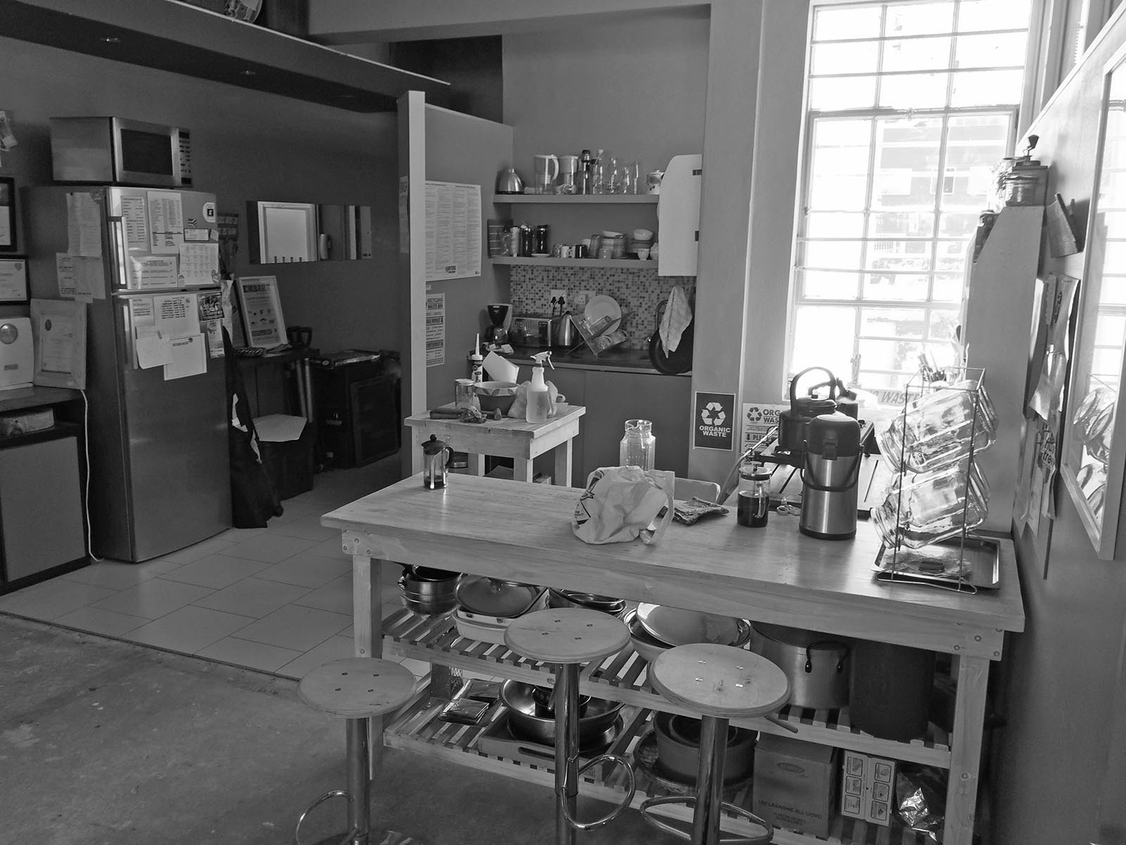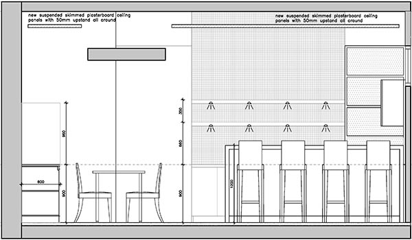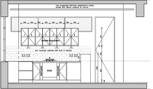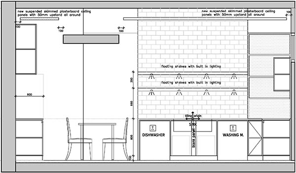 The budget was tight and nice furniture pieces were reused. The kitchen, the most expensive ‘item’ of the build, was built using standard ‘flat pack’ type carcasses, doors & open shelving combined with inexpensive hand made counters, contemporary tiles to create a modern, user friendly space with a ‘purpose made’ appearance. Existing glazed office walls were covered in funky ‘film art’ to create privacy and new ceilings & lighting were introduced to give the spaces a less industrial/more homely feel.