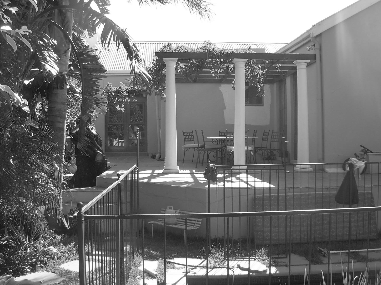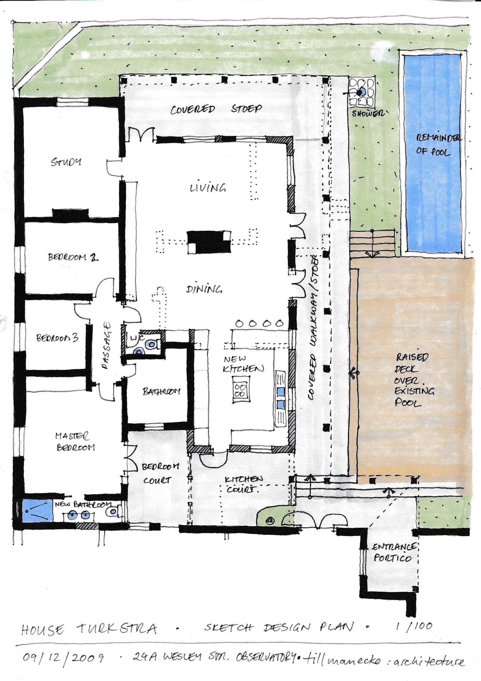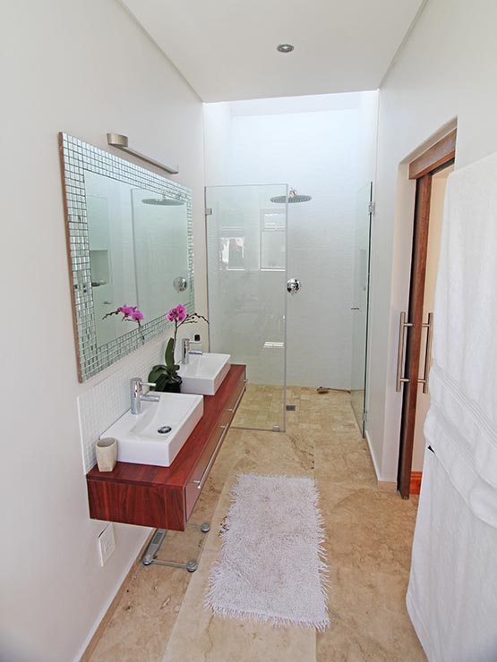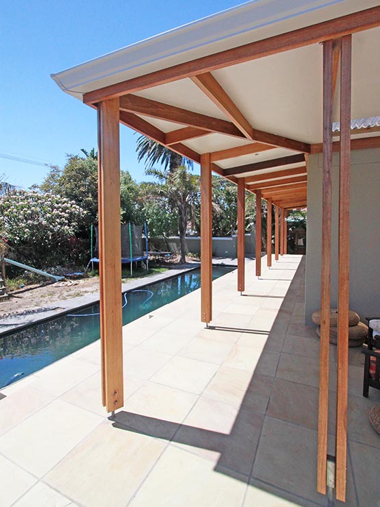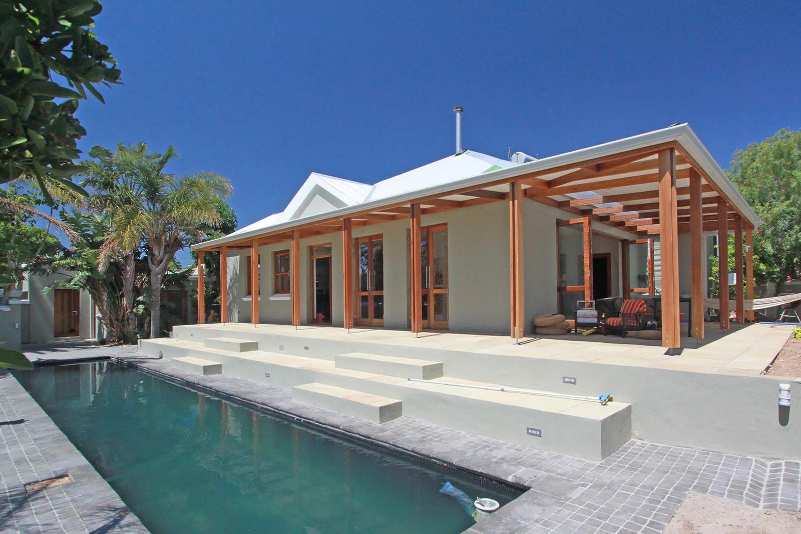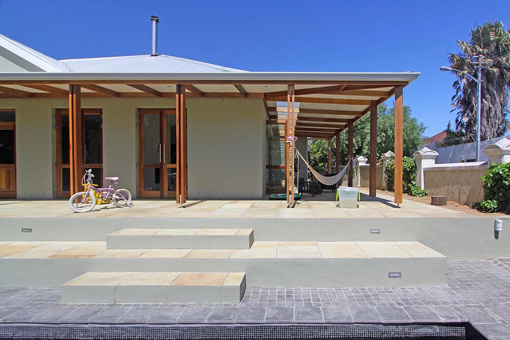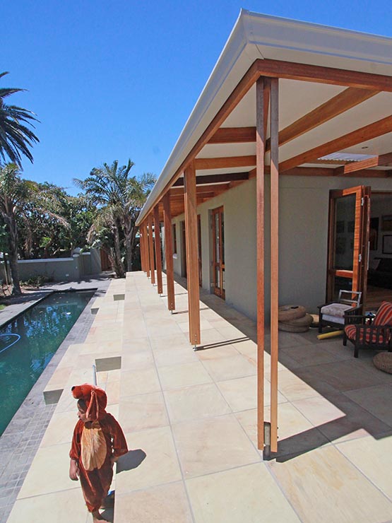 We built large ‘sitting steps’ down to the pool, adjusted the roof to cover the new kitchen and an expanded outdoor area in front of the new sliding folding doors of the lounge. We created a service yard outside the kitchen, separate from the now private master bedroom courtyard. We added a bathroom to the end of the master bedroom, with a roof window above the shower, for visual effect and added light and ventilation. The recently renovated bathroom got a new window and a guest wc was added onto one corner.