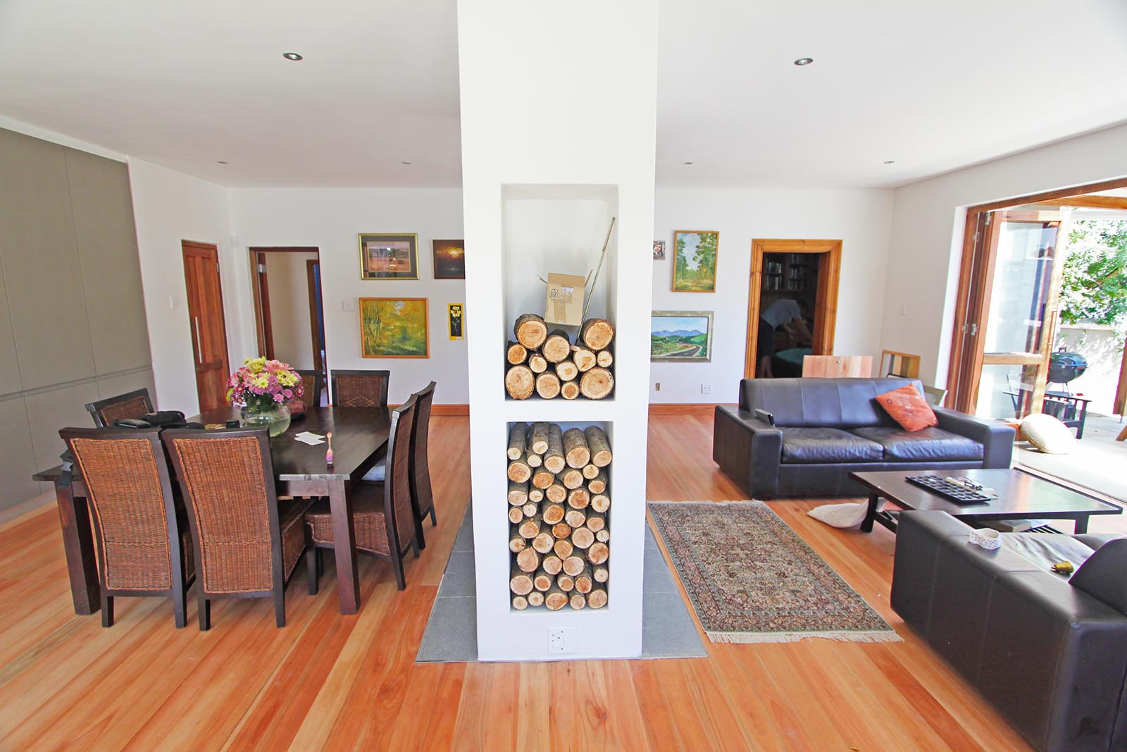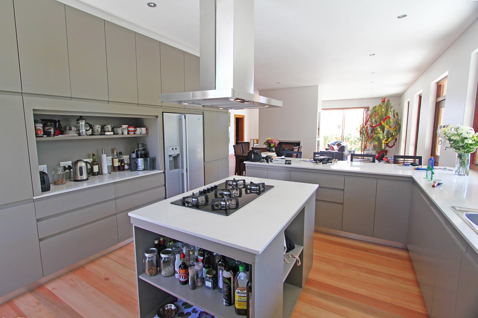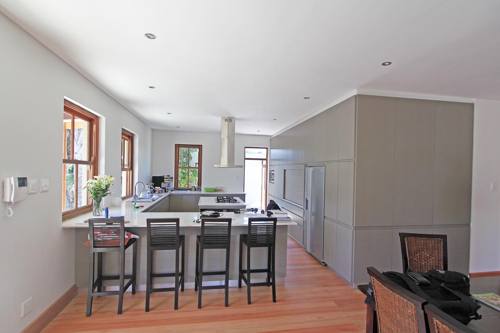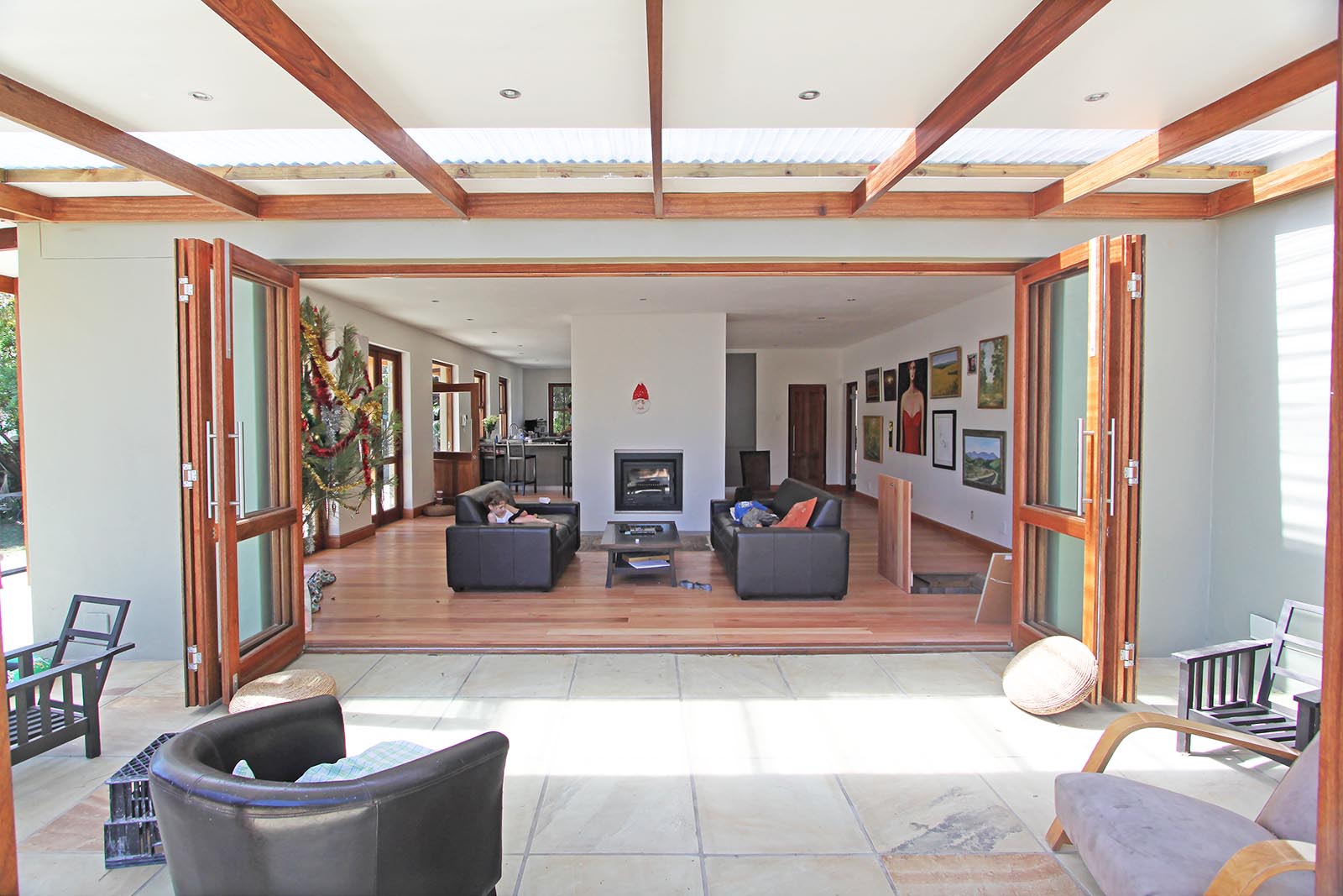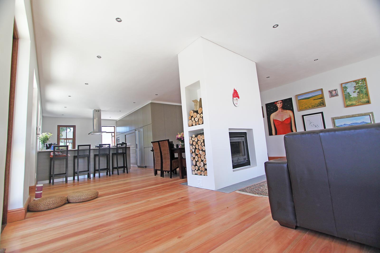 The existing timber floors were not in great shape, due to the ventilation having been cut off by the previously enclosed, surrounding stoep. The owner had a connection to a mill that supplied locally grown sugar gum floors, which were utilised throughout the living, dining and kitchen area. We endde up moving the fireplace stack slightly, as the existing brickwork was not in great shape and was required to support the adjusted roof. This also suited our desire for a slightly larger lounge and smaller dining area.