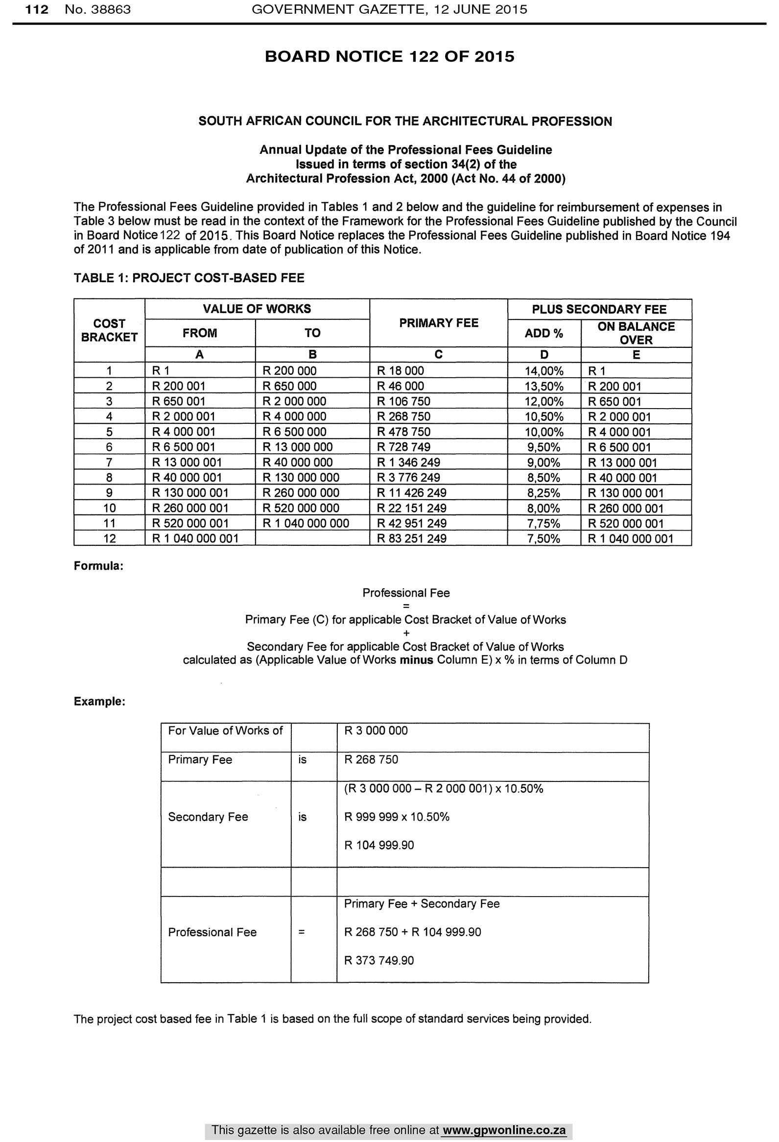 This is part of the goverment gazette and is shown in the document below. This explain the process to follow in order to calculate the the total fee for the full architectural service for a project based on its value (estimated or actual).